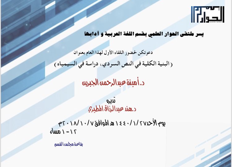 ملتقى الحوار العلمي بجامعة الملك سعود ينظم لقاء بعنوان:(البنية الكلية في النص السردي)