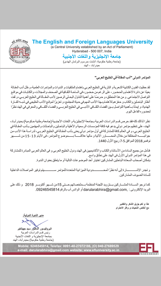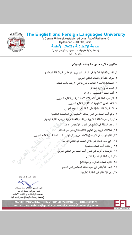 أستاذ الأدب العربى – جامعة الإنجليزية واللغات الأجنبية – حيدرآباد