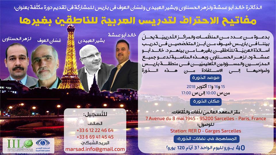 بدعوة من عدد من المنظّمات والمراكز التّدريبيّة ينظّم المرصد الأوروبّيّ لتعليم اللّغة العربيّة بالشّراكة مع المعهد العالميّ للّغات والثّقافات، دورة مكثّفة في باريس بعنوان: