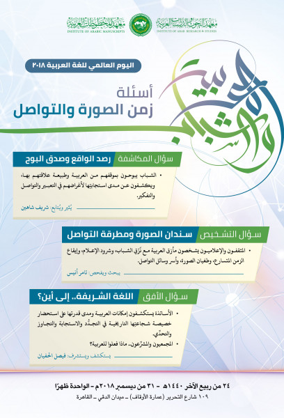 ينظم معهد المخطوطات العربية ومعهد البحوث والدراسات العربية التابعان للمنظمة العربية للتربية والثقافة والعلوم يومًا علميًا بمناسبة اليوم العالمي للغة العربية، وذلك في مقر معهد البحوث بميدان الدقي.