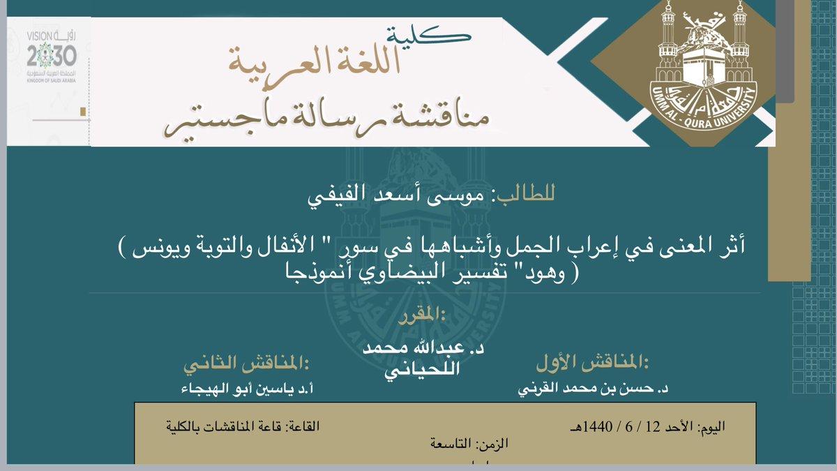 مناقشة ماجستير: "أثر المعنى في إعراب الجمل وأشباهها" في أم القرى