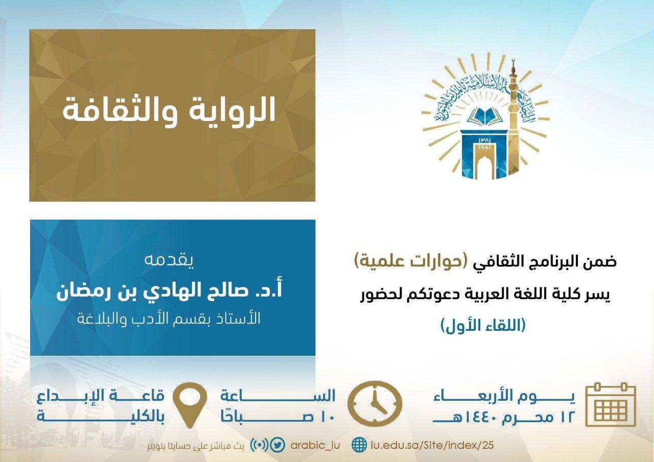 تدعوكم #كلية_اللغة_العربية_بالمدينة لحضور اللقاء العلمي: "الرواية والثقافة" في برنامج #حوارات_علمية للأستاذ الدكتور: صالح الهادي بن رمضان الأستاذ بقسم الأدب والبلاغة.