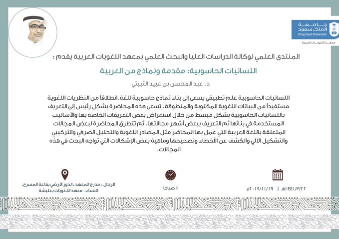 دعا المنتدى العلمي بمعهد اللغويات العربية بجامعة الملك سعود جميع المهتمين باللسانيات الحاسوبية لحضور محاضرة للدكتور عبدالمحسن الثبيتي يوم الثلاثاء القادم.