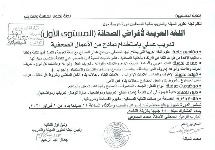 أعلنت لجنة التدريب وتطوير المهنة في نقابة الصحفيين، برئاسة جمال عبدالرحيم، وكيل أول النقابة، عن عقد دورة تدريبية جديدة بعنوان "اللغة العربية لأغراض الصحافة - المستوى الأول"، وذلك بداية من 1 فبراير المقبل.