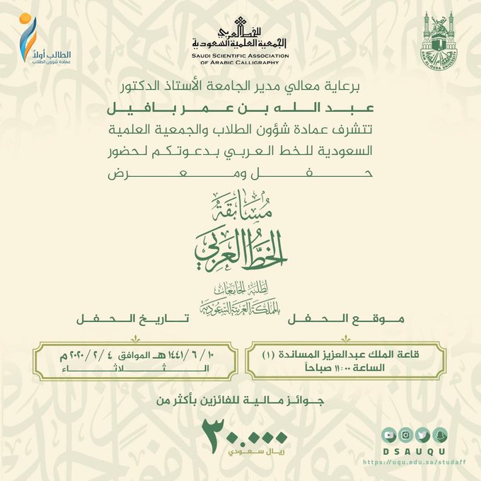 برعاية معالي مدير جامعة أم القرى دعت عمادة شؤون الطلاب والجمعية العلمية السعودية للخط العربي لحضور حفل و معرض مسابقة أم القرى للخط العربي لطلبة الجامعات السعودية يوم الثلاثاء 6/10، وقد هنأت كلّيّة اللغة العربيّة الفائزين في مسابقة الخطّ العربيّ لطلّاب الجامعات السّعوديّة الّذي أقامته الجمعيّة العلميّة السّعوديّة للخطّ العربيّ بالتّعاون مع جامعة أمّ القرى محتفيةً بما تقدّمه الجمعيّة من مزيد عنايةٍ واهتمامٍ ؛ لصيانة ثوابت الخطّ العربيّ وتطويره وتحديثه ! .