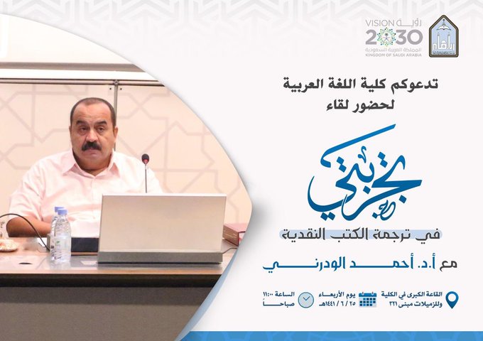 لقاء علمي بعنوان: ( تجربتي في ترجمة الكتب النقدية ) مع أ.د. أحمد الودرني