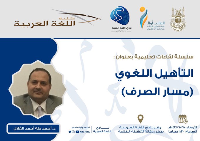 [IMG][/IMG]يقيم نادي اللغة العربيّة بكلية اللغة العربية بجامعة أمة القرى لقاءً تعليميّاً في :" التّأهيل اللغويّ ( مسار الصّرف ) " ؛ للدّكتور : أحمد بن طه الفلّال .