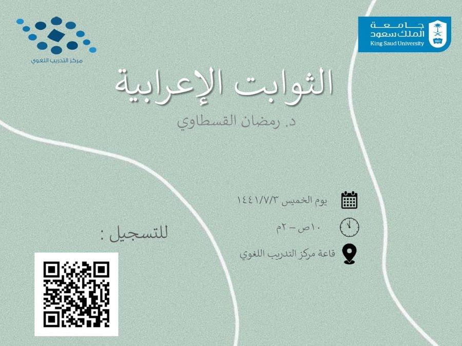 يعلن مركز التدريب اللغوي بجامعة الملك سعود عن دورة الثوابت الإعرابية يقدمها د. رمضان القسطاوي