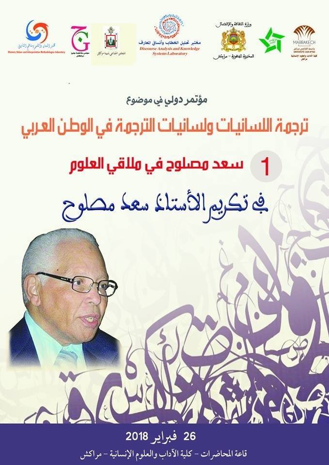 [IMG][/IMG]تكريما لأستاذ الأجيال: الدكتور سعد عبد العزيز مصلوح واعترافا بما أسهم به على دروب البحث العلمي والترجمة والممارسة الشعرية والنقد الأدبي والتحليل النصي ، ينظم مختبر تحليل الخطاب وأنساق المعارف ومختبر البيان والقيم ومناهج التأويل بكلية آداب مراكش مؤتمرا علميا وذلك يوم الإثنين 26فبراير2018.ويشكل هذا اللقاء العلمي محطة أولى في المؤتمر؛ أما المحطة الثانية، فستستمر يومي27/28فبراير2018، وستكون تكريما للزميل الأستاذ مصطفى غلفان؛ أما المحطة الثالثة، فموعدها فاتح مارس في لقاء علمي تكريمي للأستاذ محمد الدرويش.