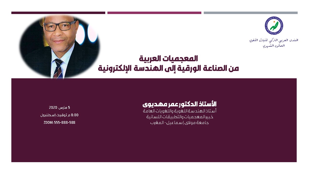 يستضيف الصالون الشهري للمنتدى العربي التركي للتبادل اللغوي سعادة الدكتور عمر مهديوي أستاذ الهندسة اللغوية واللغويات العامة، والخبير في المعجميات والتطبيقات اللسانية من جامعة مولاي إسماعيل مكناس المملكة المغربية لإلقاء محاضرة علمية تحت عنوان: المعجميات العربية من الصناعة الورقية إلى الهندسة الإلكترونية، وذلك يومه الخميس 5 مارس 2020 على الساعة الثامنة بالتوقيت التركي، والدعوة موجهة لعموم الباحثين والمهتمين لمتابعة المحاضرة على المباشر وذلك بالتسجيل على رابط صفحة المنتدى العربي التركي على الفايسبوك.