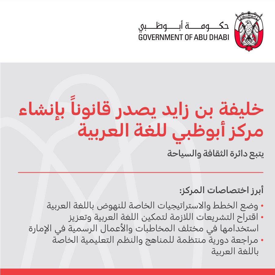 أصدر خليفة بن زايد قانونًا بإنشاء مركز أبوظبي للغة العربية، يتبع لدائرة الثقافة والسياحة - أبوظبي. تشمل اختصاصات المركز وضع الخطط والإستراتيجيات الخاصة للنهوض باللغة العربية، ورفعها للدائرة للإقرار تمهيدًا لاعتمادها من المجلس التنفيذي.