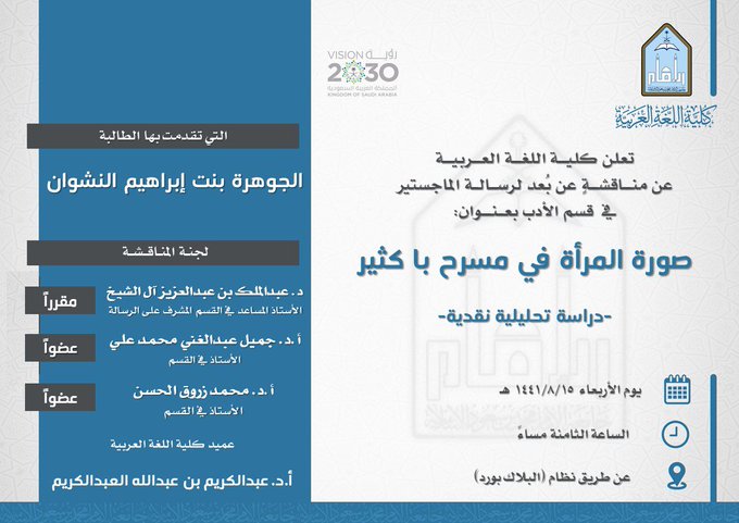 تعلن كلية اللغة العربية بجامعة الإمام عن مناقشة عن بعد لرسالة "الماجستير":