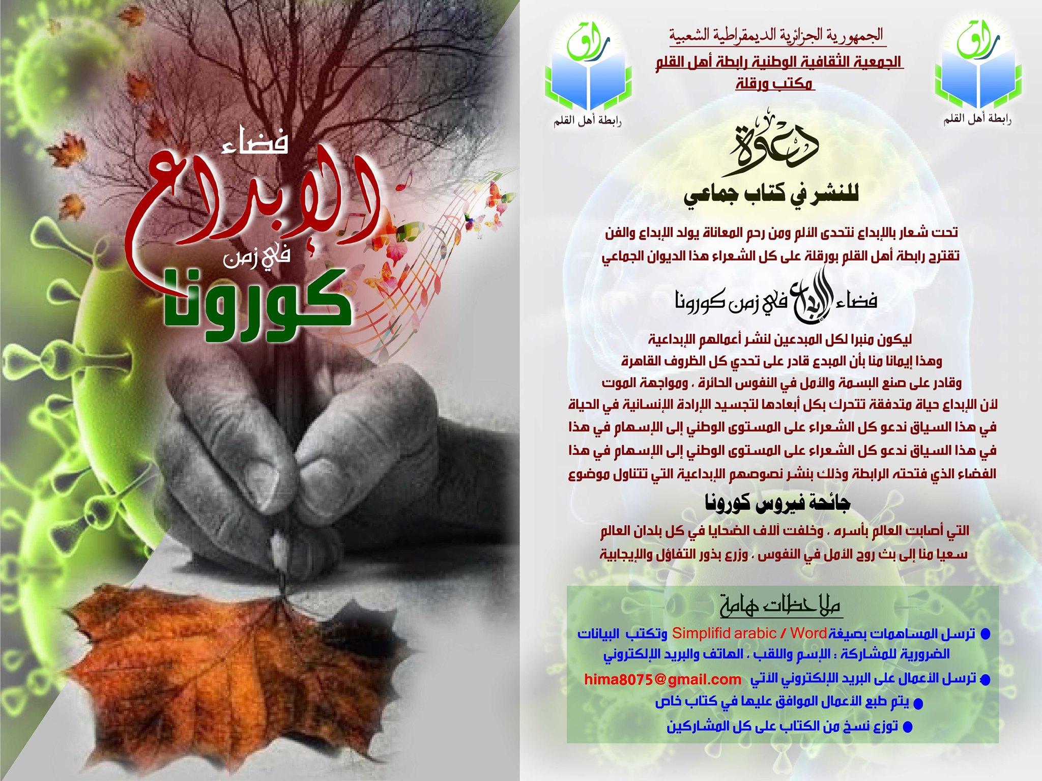 في هذا السياق ندعو كل الشعراء على المستوى الوطني إلى الإسهام في هذا الديوان الجماعي بإرسال نصوصهم الإبداعية، التي تتناول "جائحة كورونا " على أن تكون باللغة العربية الفصحى. على البريد الالكتروني الآتي: hima8075@gmail.com