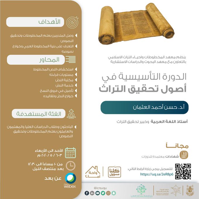 معهد المخطوطات وإحياء التراث الإسلامي بجامعة أم القرى يعلن إقامة الدورة التأسيسية في أصول تحقيق التراث