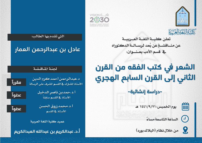تعلن #كلية_اللغة_العربية بجامعة الإمام محمد بن سعود الإسلامية عن مناقشة عن بعد لرسالة "الدكتوراه":