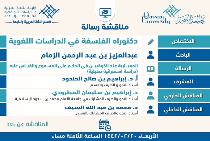 مناقشة الدكتوراه: "المعيارية عند الكوفيين في الحكم على المسموع" بجامعة القصيم