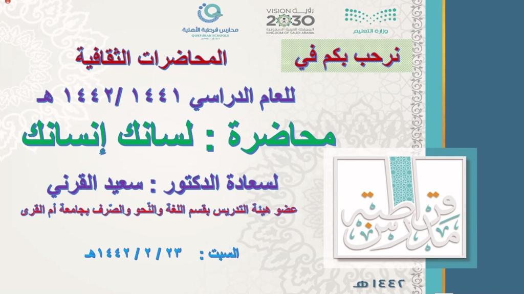 بمناسبة #اليوم_العالميّ_للمعلّم تقيم مدارس قرطبة بجدّة ندوةً علميّةً ؛ موضوعها : " لسانك إنسانك " :