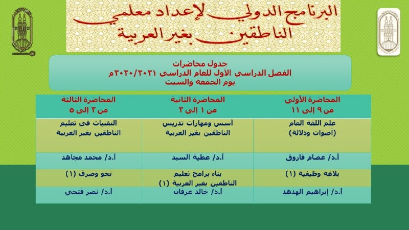 - سوف تبدأ الدراسة بالبرنامج الدولي لإعداد معلمي اللغة العربية للناطقين بغيرها يوم الجمعة الموافق 30 أكتوبر 2020.