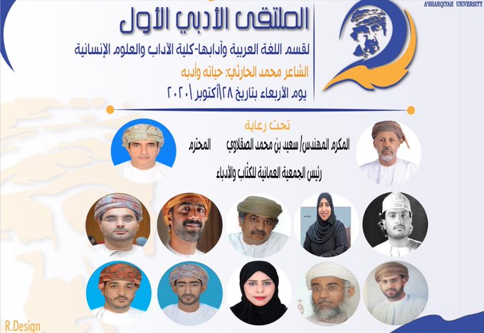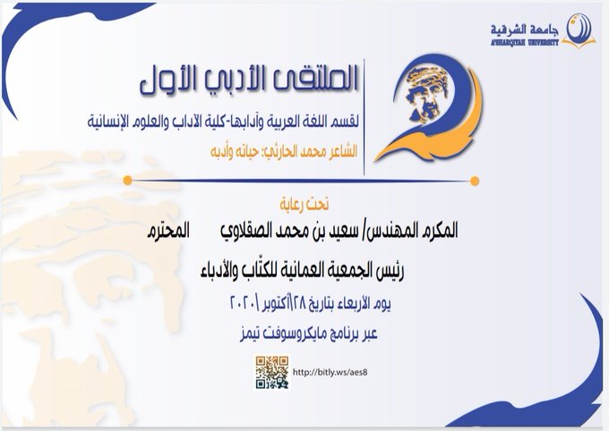 يسر كلية الآداب والعلوم الإنسانية - قسم اللغة العربية وآدابها بجامعة الشرقية - عُمان دعوتكم لحضور الملتقى الأدبي الأول لقسم اللغة العربية وآدابها: محمد الحارثي: حياته وأدبه افتراضيا وذلك في يوم الأربعاء بتاريخ 28 أكتوبر 2020 عبر برنامجMicrosoft Teams عبر الرابط http://bitly.ws/aes8