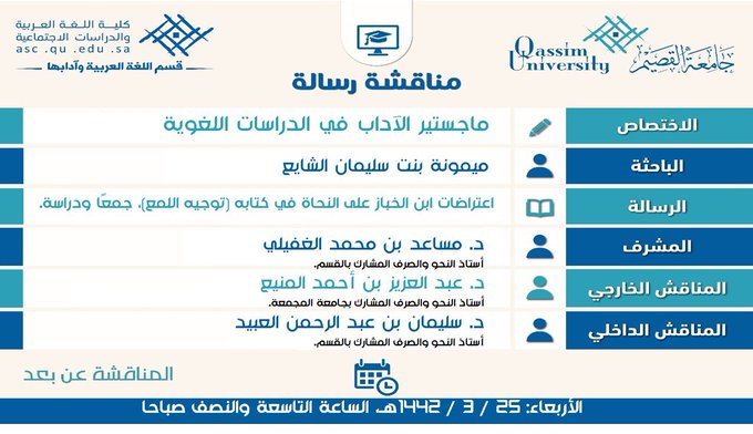 مناقشة الماجستير: اعتراضات ابن الخباز على النحاة في كتابه توجيه اللمع بجامعة القصيم