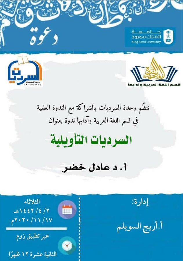 ندوة بعنوان:"السرديات التأويلية"بوحدة السرديات بقسم اللغة العربية وآدابها بالملك سعود