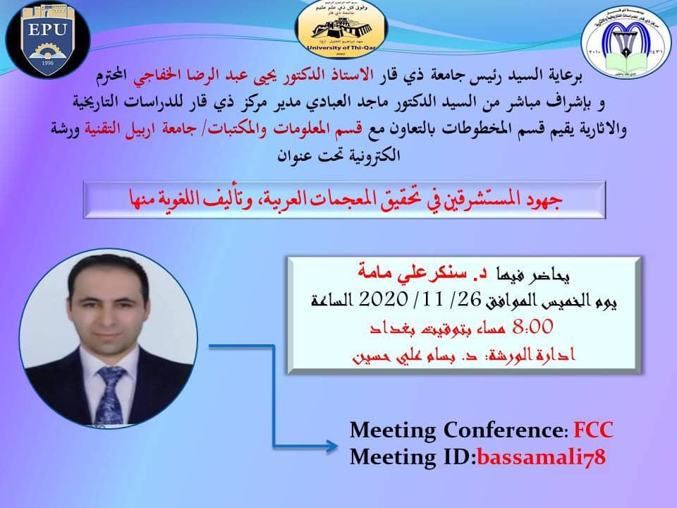 ورشة إلكترونية بعنوان: جهود المستشرقين في تحقيق المعجمات العربية وتأليف اللغوية منها