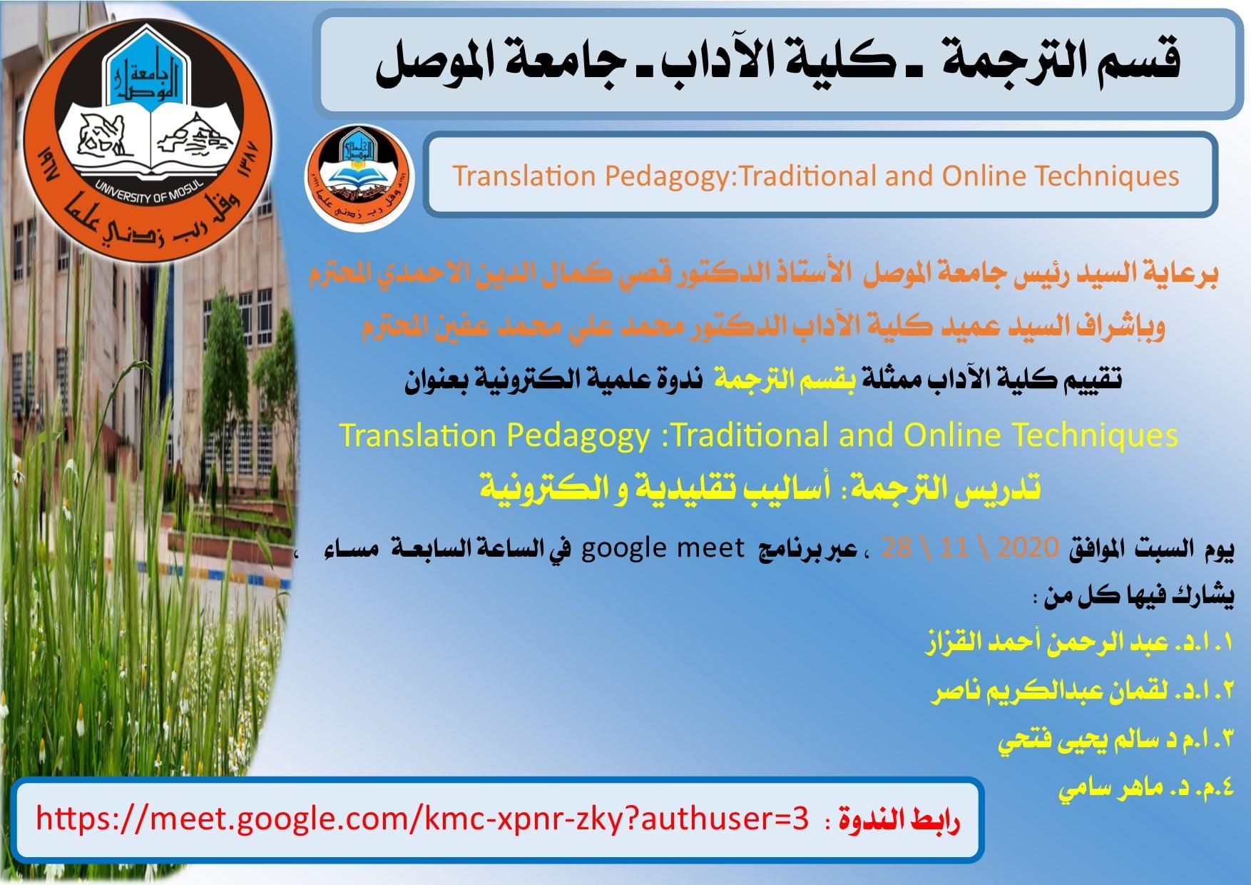 ندوة علمية إلكترونية بعنوان: تدريس الترجمة: أساليب تقليدية وإلكترونية بجامعة الموصل