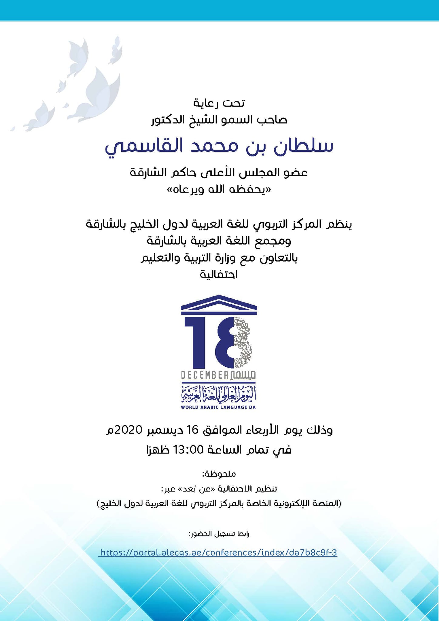 [IMG][/IMG]ينظم المركز التربوي للغة العربية لدول الخليج بالشارقة ومجمع اللغة العربية الشارقةبالتعاون مع وزراة التربية والتعليم احتفالية اليوم العالمي للغة العربية "عن بُعد"، تحت رعاية صاحب السمو الشيخ الدكتور/ سلطان بن محمد القاسمي عضو المجلس الأعلى حاكم الشارقة -"يحفظه الله ويرعاه"-، وذلك يوم الأربعاء الموافق 16 ديسمبر 2020م في تمام الساعة 13:00 ظهرًا، ويتضمن برنامج الحفل ندوة بعنوان: "المعجم التاريخي للغة العربية ودوره في التمكين للسان العربي (الأثر والتحديات)".