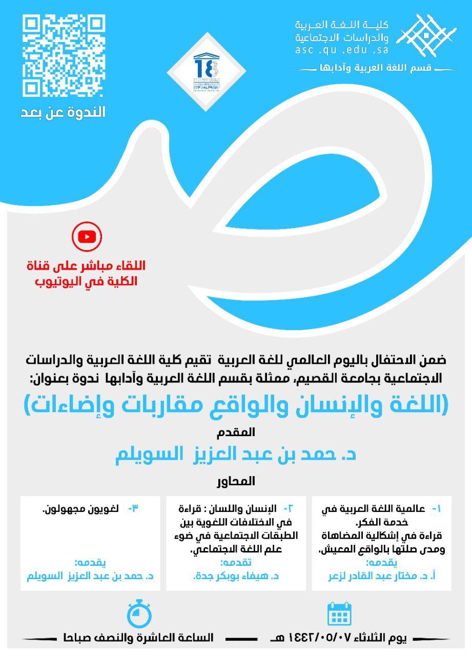 بمناسبة #اليوم_العالمي_للغة_العربية تقيم كلية اللغة العربية والدراسات الاجتماعية بجامعة القصيم ممثلة بقسم اللغة العربية وآدابها ندوة علمية بعنوان (اللغة والإنسان والواقع مقاربات وإضاءات) يوم الثلاثاء ١٤٤٢/٥/٧ الساعة العاشرة والنصف صباحا.
