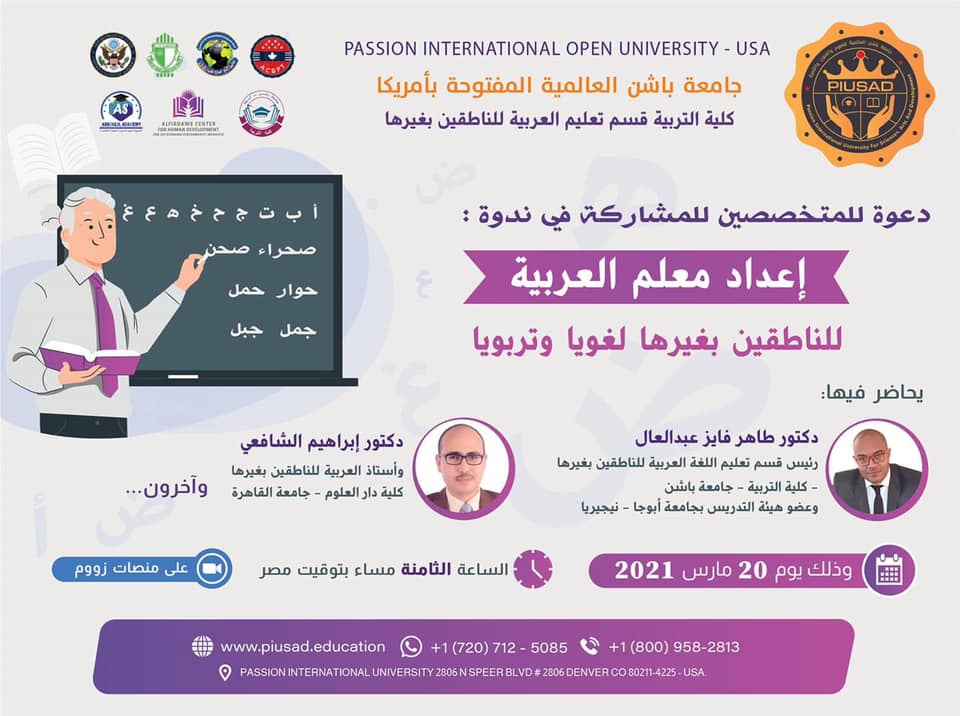 [IMG][/IMG]تقدم كلية التربية قسم تعليم العربية للناطقين بغيرها ، جامعة باشن العالمية المفتوحة بأمريكا 🌹دعوة🌹 للمتخصصين للمشاركة في ندوة : ( إعداد معلم العربية ) للناطقين بغيرها لغويا وتربويا.
