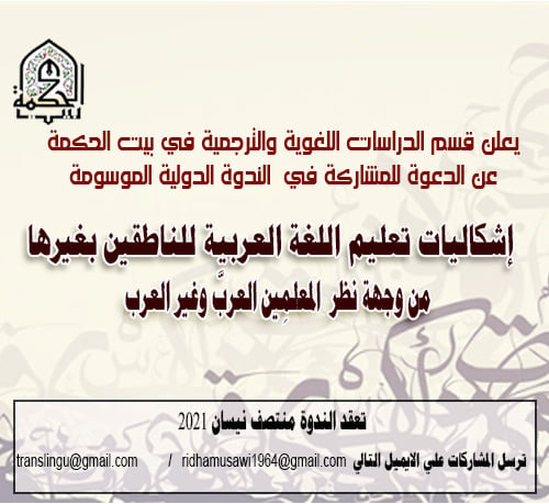 [IMG][/IMG]يعلن قسم الدراسات اللغوية والترجمية في بيت الحكمة عن الدعوة للمشاركة في الندوة الدولية الافتراضيةالموسومة :