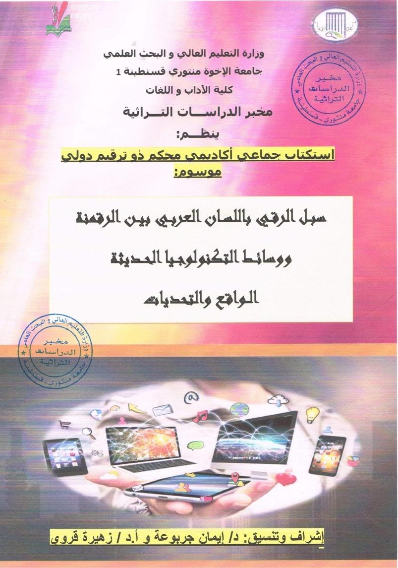 يدعو مخبر الدراسات التراثية ووحدة بحث "الاتجاهات اللسانية المعاصرة" ، جامعة قسنطينة 01، كافة الأكادميين والباحثين والمهتمين بالشأن اللغوي، إلى المشاركة والإسهام في تحرير استكتاب جماعي محكم؛ يتناول موضوع ّ - الواقع والتحديات-" احتفاء باللغة العربية في يومها العربي (01 مارس)، وتفعيلا لأنشطة المخبر، ووعيا بضرورة المساهمة في خدمة اللغة العربية والرقي بها لتكون في مصاف اللغات المتطورة رقميا.