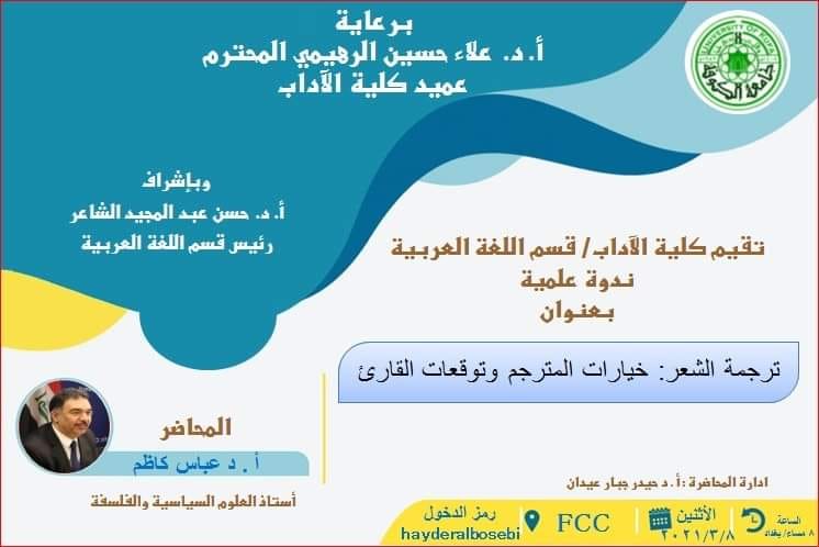 الندوة العلمية الموسومة بترجمة الشعر: "خيارات المترجم وتوقعات القارئ"، للأستاذ الدكتور عباس كاظم، المقيم في الولايات المتحدة الأمريكية، يوم الاثنين 3/8، الساعة الثامنة مساء بتوقيت بغداد على برنامج fcc، ورمز الدخول هو hayderalbosebi ، وستُمنح شهادة حضور.