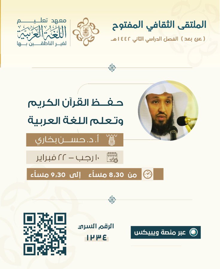[IMG][/IMG]يدعوكم معهد تعليم اللغة العربية بجامعة أم القرى لحضور اللقاء الأول الذي يقيمه غداً الاثنين في الساعة ٨.٣٠ مساءً ضمن سلسلة لقاءات الملتقى الثقافي المفتوح، وعنوانه "حفظ القرآن الكريم وتعلم اللغة العربية"، يقدمه عميد المعهد أ.د. حسن بخاري.