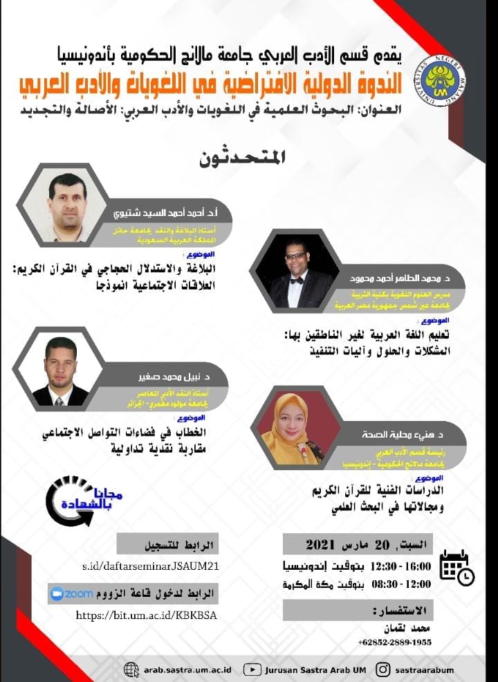 [IMG][/IMG]يدعوكم قسم اللغة العربية والدراسات الإسلامية بكلية التربية بجامعة عين شمس وقسم الأدب العربي كلية الآداب جامعة مالانج الحكومية في إندونيسيا إلى الندوة الدولية الافتراضية في اللغويات والأدب العربي*