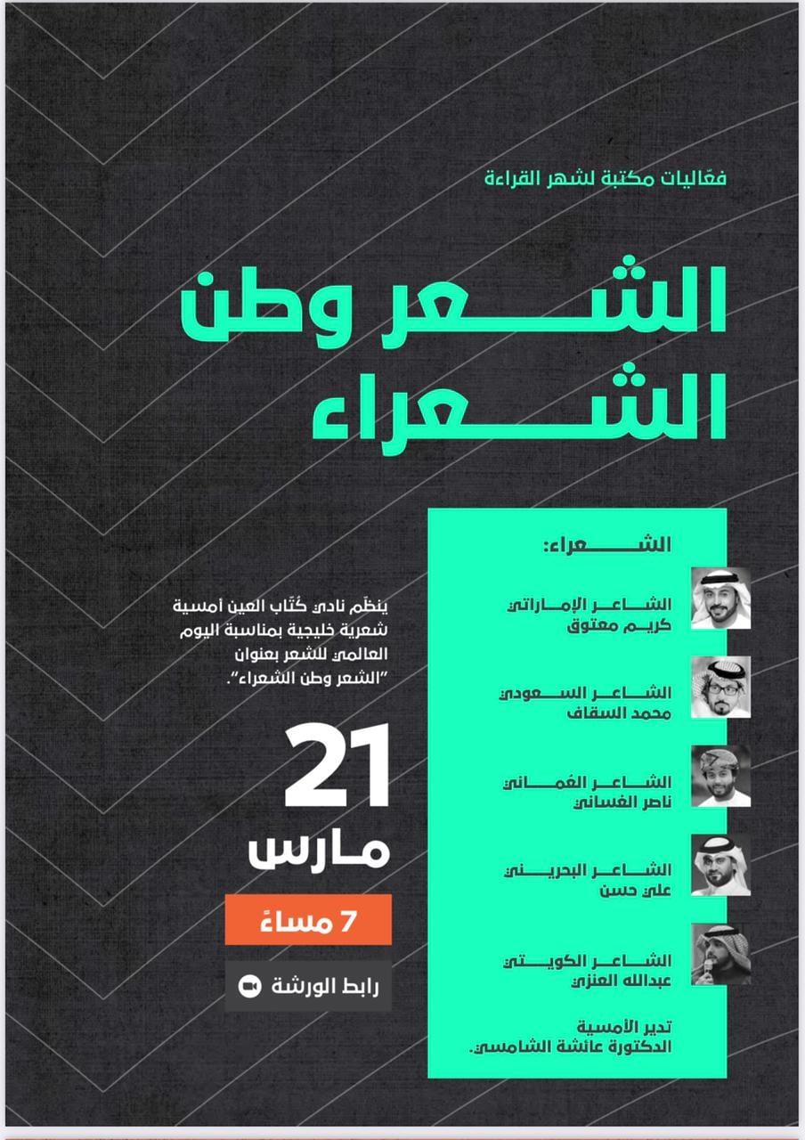 تقيم مكتبة زايد المركزية ونادي العين الأدبي الأمسية الشعرية: "الشعر وطن الشعراء" بمناسبة الاحتفال باليوم العالمي للشعر، وتستضيف فيها كوكبة من شعراء الخليج العربي، وهم: