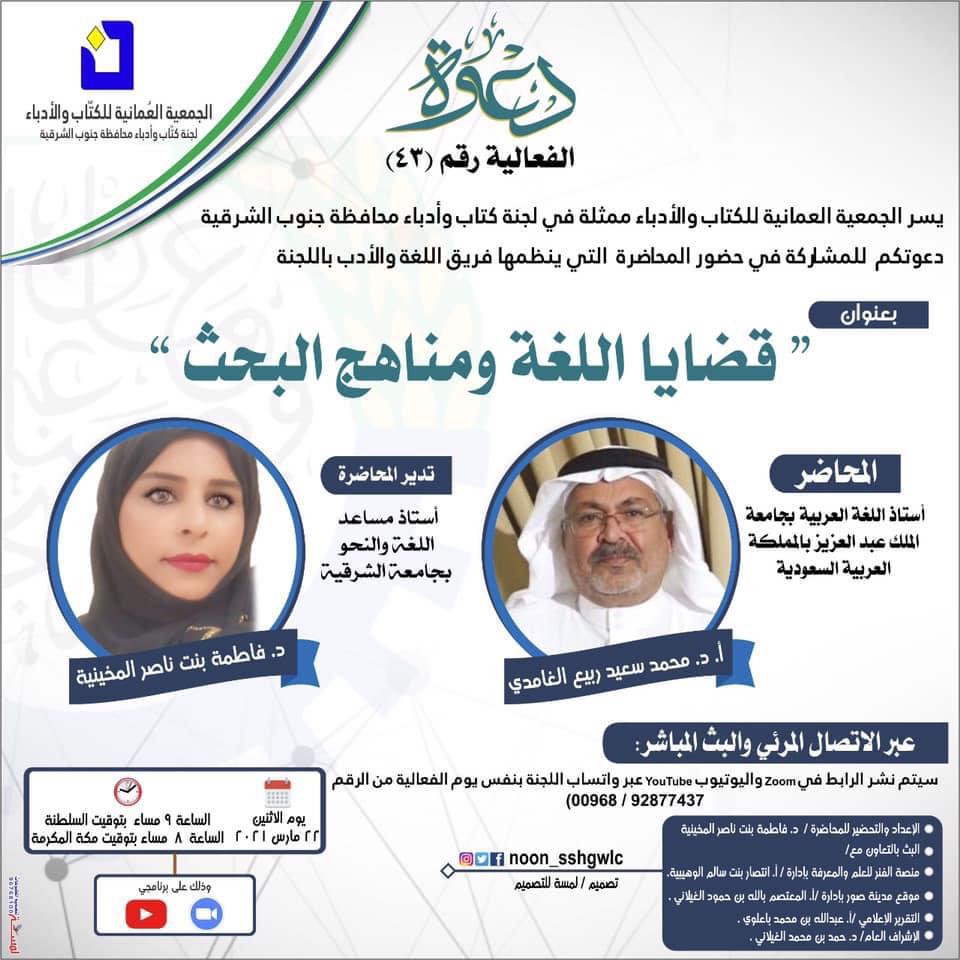 يسر الجمعية العمانية للكتاب والأدباء ممثلة في لجنة كتاب وأدباء محافظة جنوب الشرقية دعوتكم للمشاركة في حضور المحاضرة التي ينظمها فريق اللغة والأدب باللجنة بعنوان: