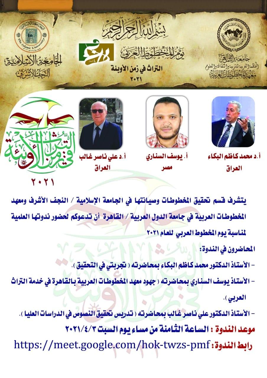 ندوة بمناسبة يوم المخطوط العربي بعنوان: "التراث في زمن الأوبئة"برعاية الجامعة العربية