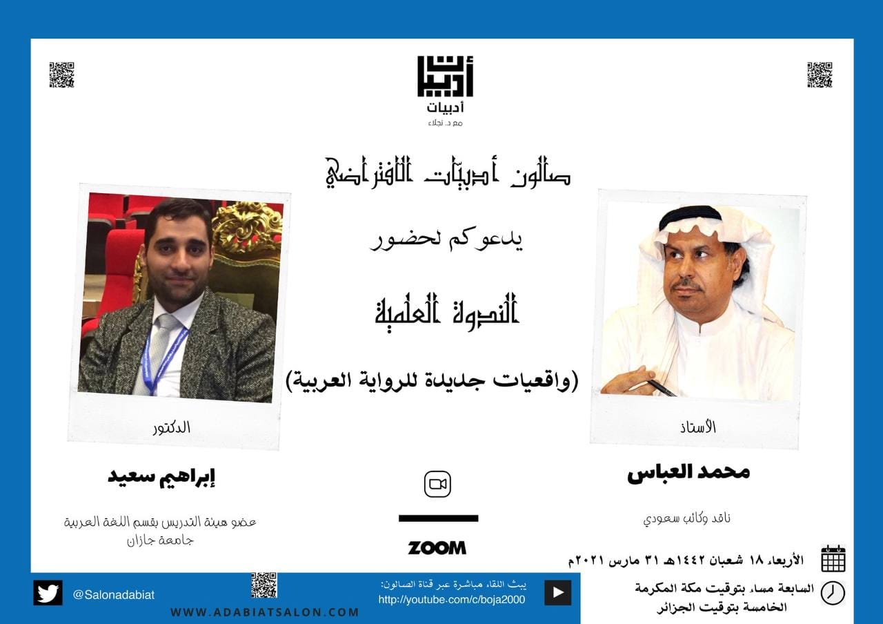 [IMG][/IMG]صالون أدبيات الافتراضي يدعوكم مساء هذا اليوم ٣١ مارس الساعة السابعة مساء بتوقيت مكة المكرمة والعراق - الخامسة بتوقيت الجزائر- الثامنة بتوقيت الإمارات لحضور الندوة العلمية تحت عنوان: (واقعيات جديدة للرواية العربية)، تقديم الناقد الأستاذ محمد العباس، إدارة د. إبراهيم سعيد.