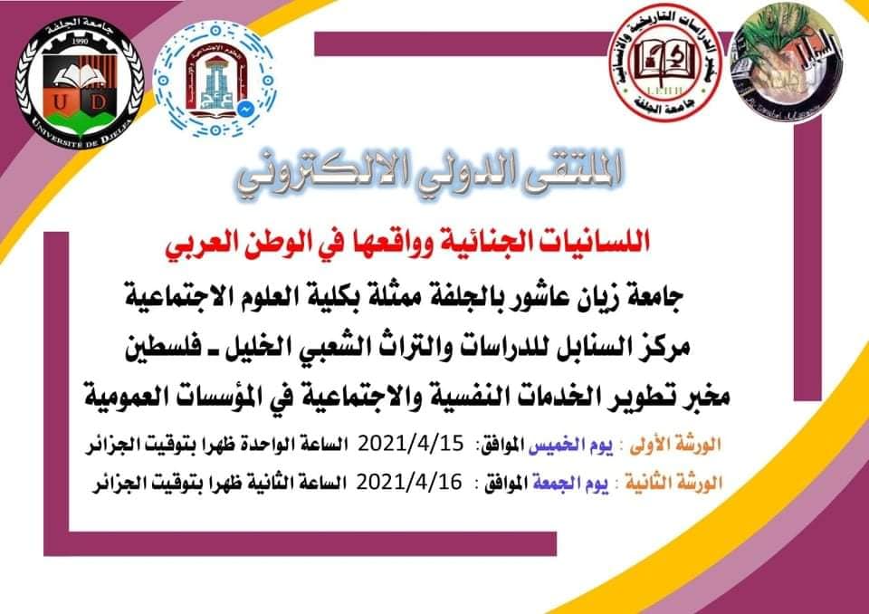 [IMG][/IMG]الملتقى الدولي الافتراضي (اللسانيات الجنائية وواقعها في الوطن العربي) الذي نظمته جامعة زيان عاشور بالجلفة ممثلة بكلية العلوم الاجتماعية