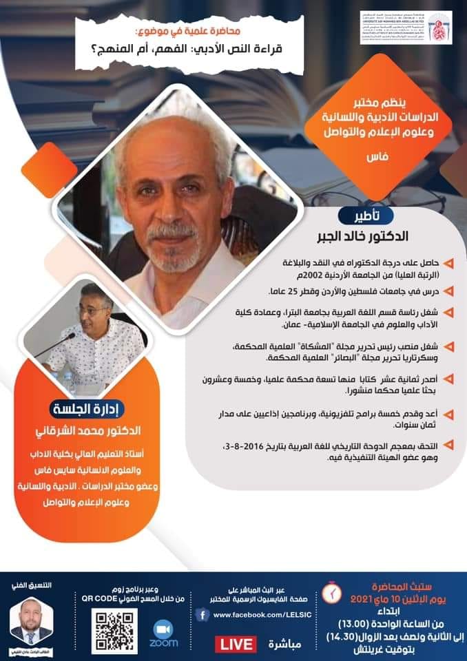 [IMG][/IMG]ينظم مختبر الدراسات الأدبية واللسانية وعلوم الإعلام والتواصل بكلية الآداب والعلوم الإنسانية سايس جامعة سيدي محمد بن عبد الله فاس ضمن فعاليات برنامج التكوينات الإجبارية محاضرة عن بعد في موضوع "قراءة النص الأدبي: الفهم أم المنهج؟" من تاطير الدكتور خالد الجبر خبير لغوي معجم الدوحة التاريخي للغة العربية والمركز العربي للأبحاث ودراسة السياسات .