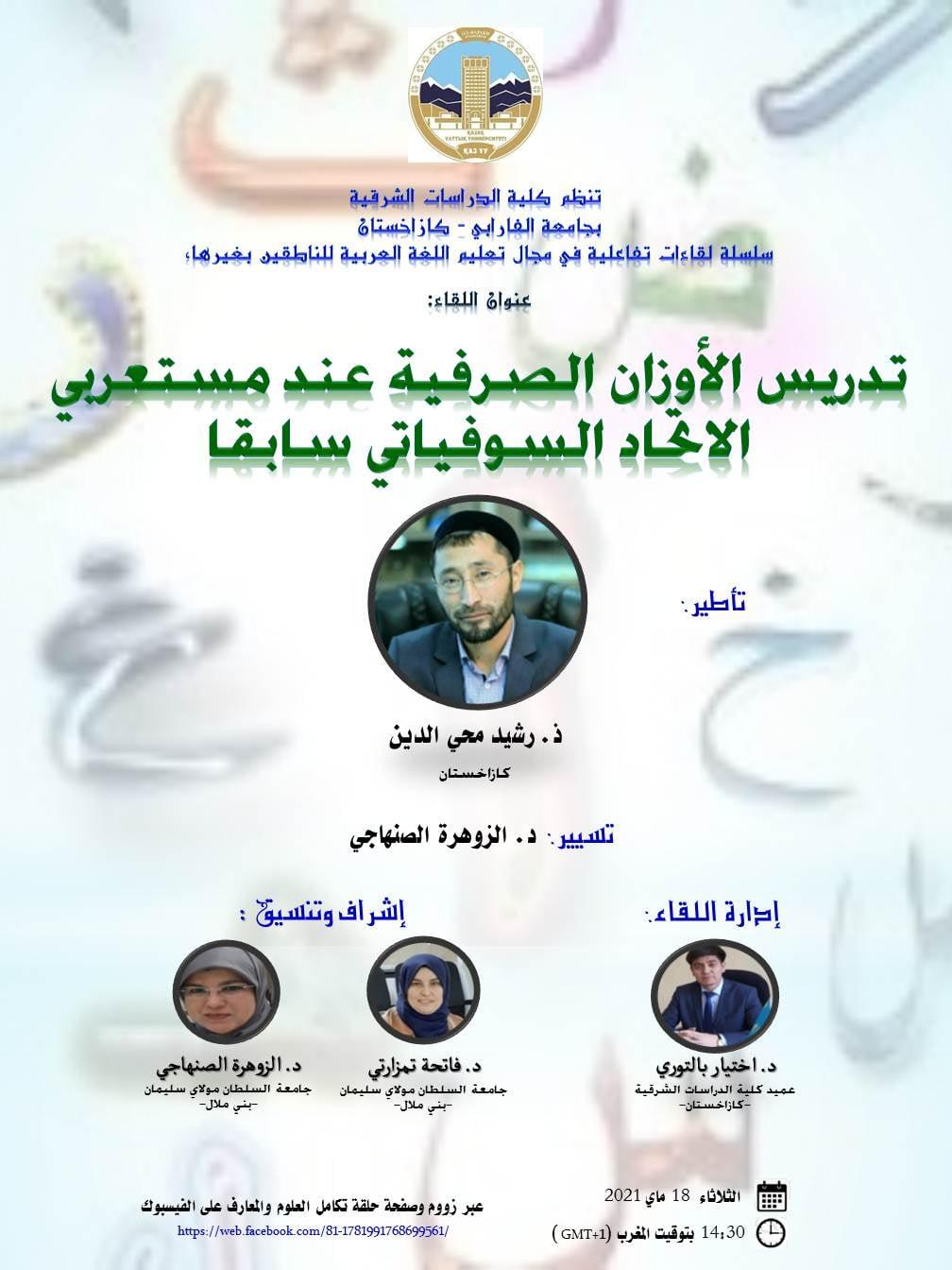 تنعقد قريبًا أول اللقاءات التفاعلية في مجال تعليم اللغة العربية ، والتي ستنظمها كلية الدراسات الشرقية، جامعة الفارابي، كازاخستان ، والبداية مع ذ. رشيد محي الدين من كازاخستان.