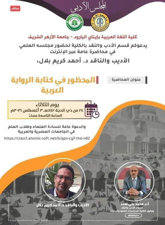 [IMG][/IMG]ينظم المجلس العلمي (كلية اللغة العربية -جامعة الأزهر الشريف) محاضرة عبر الإنترنت موضوعها (المحظور في كتابة الرواية العربية)