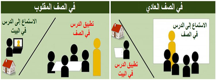 أما الصفوف المعكوسة (المقلوبة) فتقوم على قلب نظام التعلم التقليدي، فبعد أن كان الطالب يستمع إلى الدرس في الصف ويجيب على الأسئلة في البيت سيستمع إلى الدرس في البيت من خلال فيديو مرئي “يسجله المعلم ويشرح فيه الدرس المقرر ويستعين فيه بكل الوسائل التقنية السمعية والبصرية المتاحة لتوضيح الدرس للطلاب وجذبهم إليه. أما في الصف الدراسي فسيقوم الطالب بتطبيق كل ما تعلمه في البيت عمليا أمام معلمه من خلال عدد من الأنشطة والفعاليات المختلفة“ [1]، فتحول بذلك دور المعلم في الصف من ملقن إلى موجه ومساعد ومحفز للطلاب يشرف على سير الأنشطة ويقدم الدعم لمن يحتاج إليه، و”يتمكن المعلم من قضاء مزيد من الوقت في التفاعل مع طلابه داخل الصف بدلاً من إلقاء المحاضرات“[2]، أما الطالب فأصبح المحور الرئيسي في عملية التعلم وتحول إلى باحث و مستخدم للتقنية بفاعلية من خلال التعلم خارج الفصول الدراسية معززًا التفكير الناقد والتعلم الذاتي وبناء الخبرة ومهارات التواصل والتعاون بينه وبين بقية الطلاب.