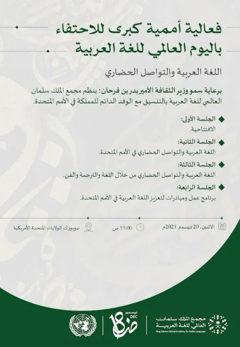 [IMG][/IMG]برعاية الأمير بدر بن عبدالله بن فرحان، وزير الثقافة، يحتفل مجمع الملك سلمان العالمي للغة العربية، بالتعاون مع الوفد الدائم للمملكة العربية السعودية في منظمة الأمم المتحدة، يوم الاثنين المقبل الموافق 20 ديسمبر الجاري، باليوم العالمي للغة العربية، في مدينة نيويورك بالولايات المتحدة الأمريكية.