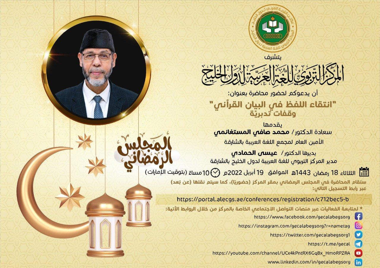 يسر #المركز_التربوي_للغة_العربية_لدول_الخليج دعوتكم لحضور محاضرة بعنوان: "انتقاء اللفظ في البيان القرآني- وقفات تدبرية"، ضمن فعاليات المجلس الرمضاني والتي ستقام يوم الثلاثاء 18 رمضان 1443هـ الموافق 19 أبريل 2022م الساعة 10 مساءً بتوقيت الإمارات.