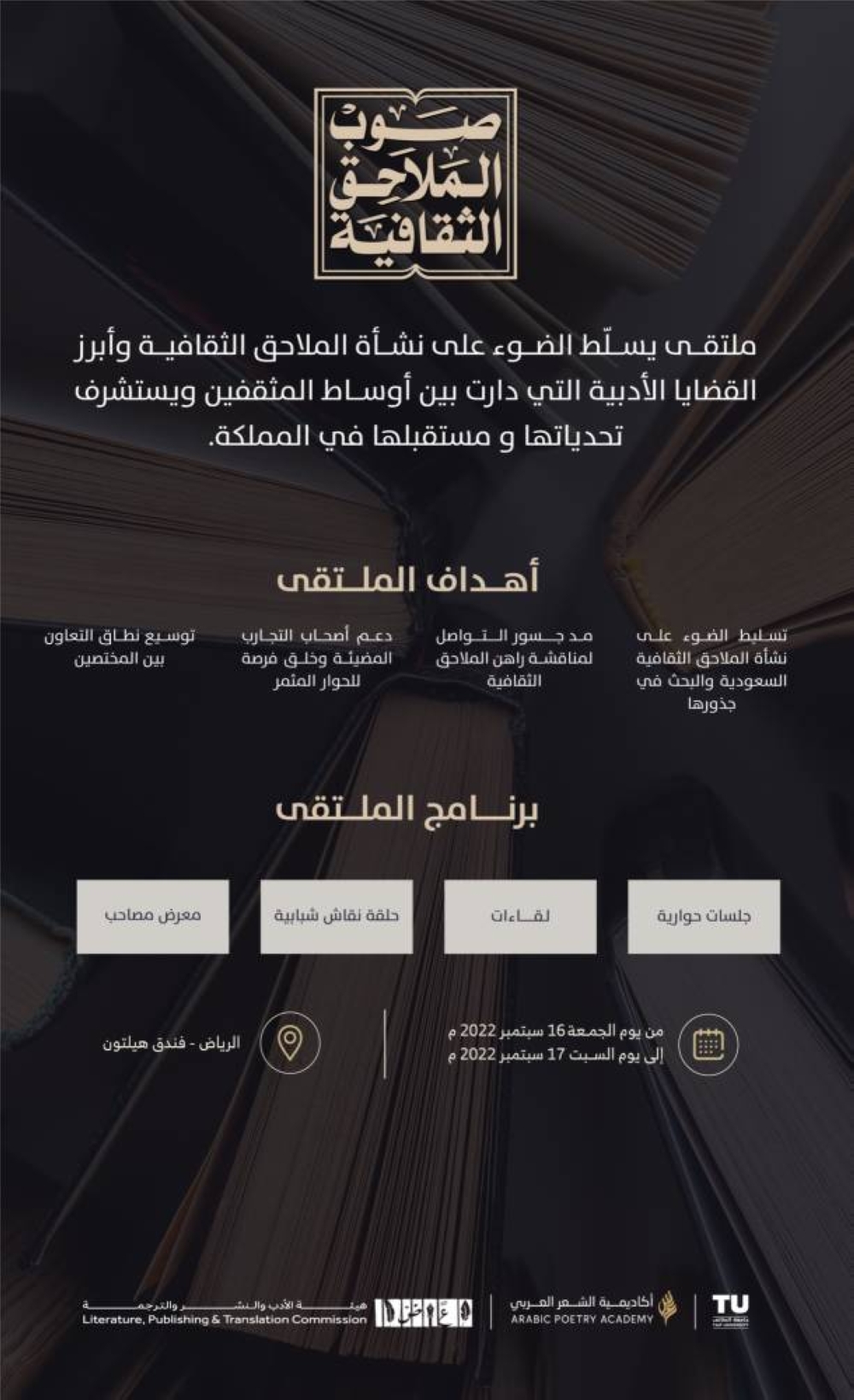 بدعمٍ من هيئة الأدب والنشر والترجمة، تنظّم أكاديمية الشعر العربي ملتقى صوب الملاحق الثقافية استحضارًا لدور الملاحق الثقافية في تشكيل المشهد الأدبي السعودي.