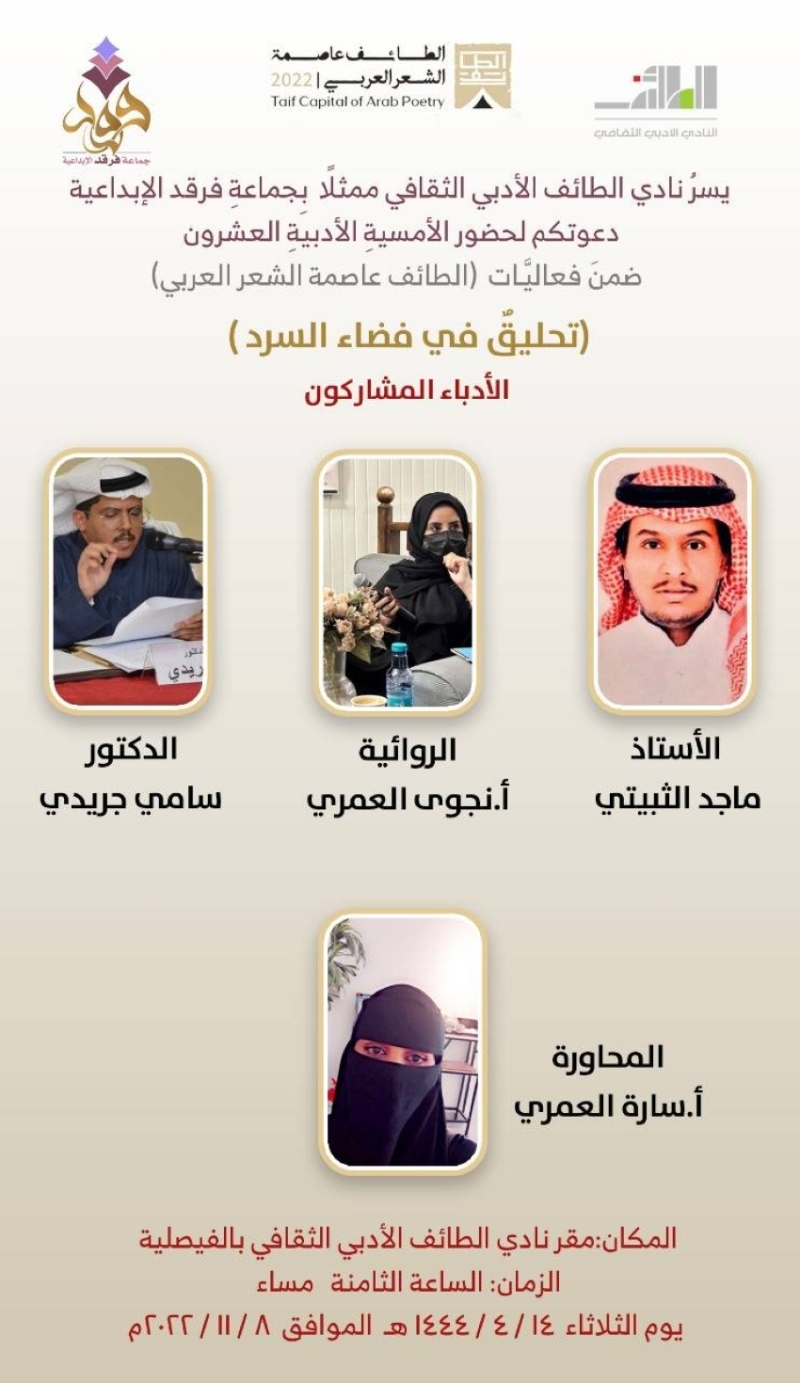 نظم النادي الثقافي الأدبي بالطائف مساء الأمسية العشرون ضمن فعاليات الطائف عاصمة الشعر العربي 2022 وذلك بمقر النادي بالفيصلية وقد شارك في الأمسية كل من : الدكتور سامي جريدي المنصوري، و ماجد الثبيتي، و نجوى العمري .