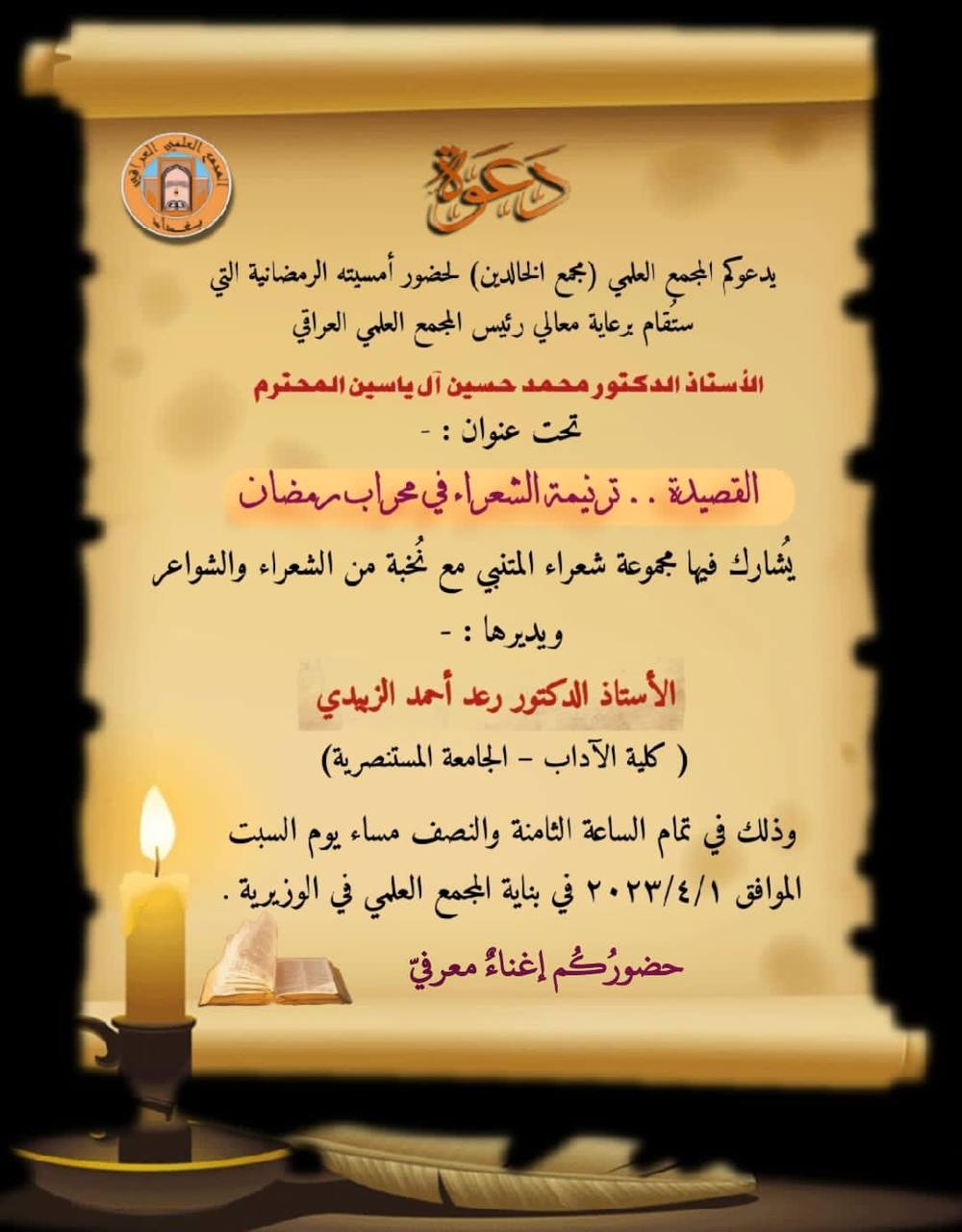 وذلك في تمام الساعة الثامنة والنصف مساء يوم السبت الموافق ٢٠٢٣/٤/١ في بناية المجمع العلمي في الوزيرية.
