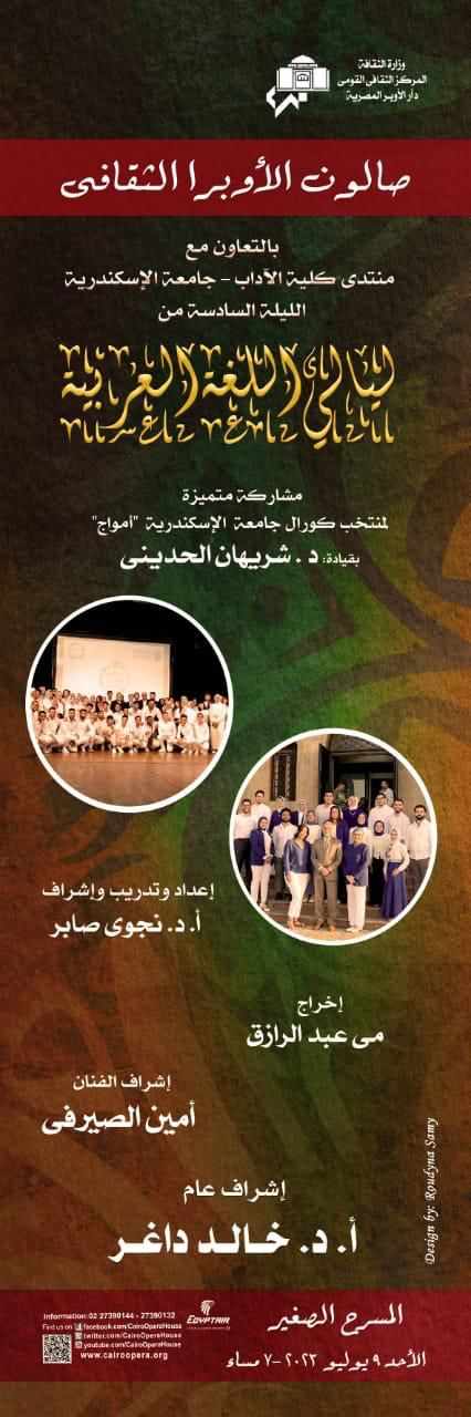 يعقد صالون الأوبرا الثقافى لقاء بعنوان "ليالى اللغة العربية" يشرف عليه الفنان أمين الصيرفي، وخلاله يلقى مجموعة من الطلاب مجموعة من القصائد الشعرية إلى جانب عدد من الأعمال الغنائية بمشاركة كورال جامعة الإسكندرية "أمواج" بقيادة الدكتورة شريهان الحديني وإشراف الدكتورة نجوى صابر ومن إخراج مى عبد الرازق وذلك في السابعة مساء الأحد 9 يوليو بالمسرح الصغير.